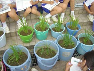 撮影。1学期最後の稲の観察です。このあと夏休みのために,各自バケツ稲を持ち帰りました。
