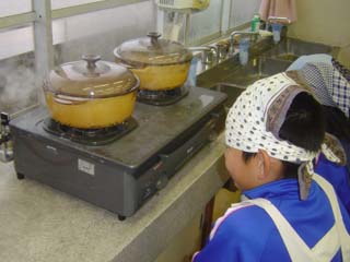 炊飯器ではなく鍋でごはんを炊くのはこれで2度目。前回家庭科でお米を炊いた時は,さすがにこげてしまいました。今回は貴重なお米だけに,失敗は許されません! こげないように鍋をしっかり見張っていました。 |