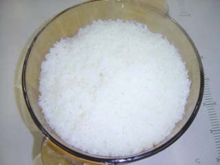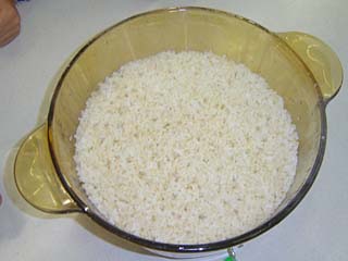 量の確保と”食べ比べ”のために,市販の福井産コシヒカリも炊きました。こちらもこげずにでき,白くて確かにおいしそう。自分たちでつくった日本晴は,このお米に勝てるでしょうか? |