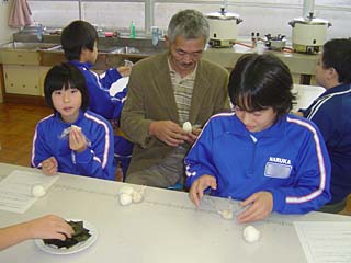前田さんも子どもたちとともにおにぎりを試食しました。ここまでできたのも,前田さんのご指導のおかげです。思い通りの味になったでしょうか… |