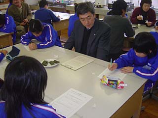いよいよ収穫感謝祭の始まりです。先生方や前田さんには前もって招待状を送りました。それぞれの班に座っていただき,さっそくおにぎりを試食しました。 |