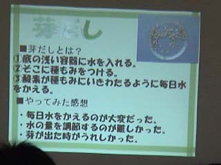 芽出し,田植えから収穫,精米までの過程を,一人1ページずつのプレゼンテーションにまとめました。今後当HPでも紹介できるかと思います。 |